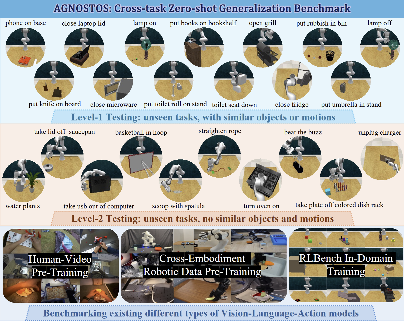 |   | Exploring the Limits of Vision-Language-Action Manipulations in Cross-task Generalization Jiaming Zhou, Ke Ye, Jiayi Liu, Teli Ma, Zifan Wang, Ronghe Qiu, Kun-Yu Lin, Zhilin Zhao, Junwei Liang*
